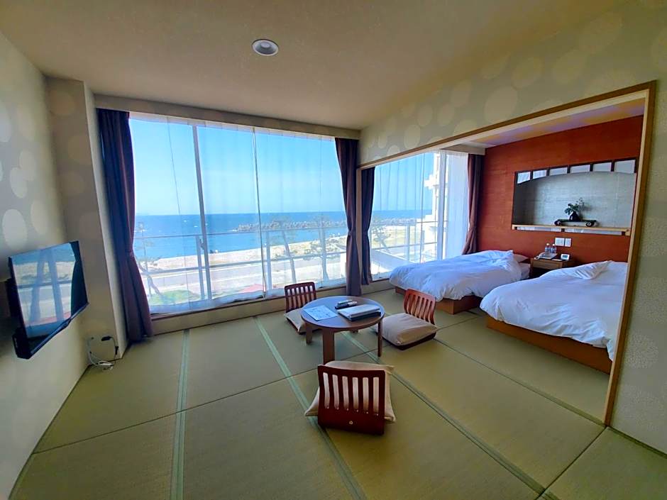 The triple room includes a private bathroom, well-fitted with a bath, a shower, a bidet, a hairdryer and slippers. The air-conditioned triple room offers a flat-screen TV, tatami, soundproof walls, a wardrobe as well as sea views. The unit offers 2 beds and 1 futon.